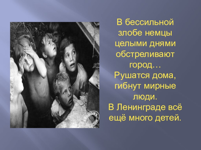 В бессильной злобе немцы целыми днями обстреливают город…Рушатся дома, гибнут мирные люди.В Ленинграде всё ещё много детей.
