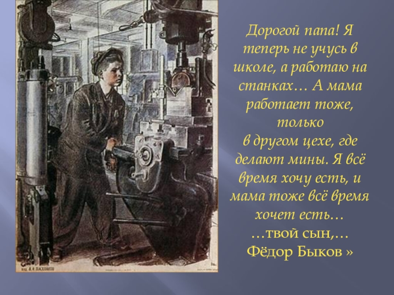 Дорогой папа! Я теперь не учусь в школе, а работаю на станках… А мама работает тоже, тольков