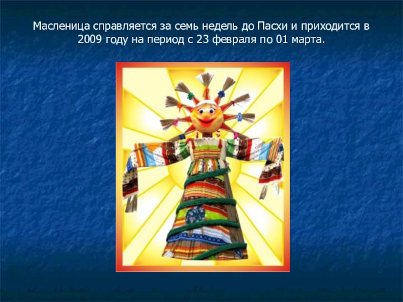 Слайд 2Масленица справляется за семь недель до Пасхи и приходится в 2009