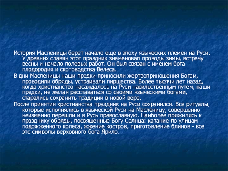 В дни Масленицы наши предки приносили жертвоприношения Богам, проводили обряды, устраивали пиршества. Более тысячи лет назад, когда христианство насаждалось на Руси насильственным путем, наши предки, не желая расставаться со своими языческими богами, старались сохранить традиции в новой вере.
