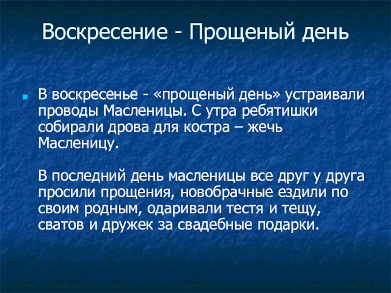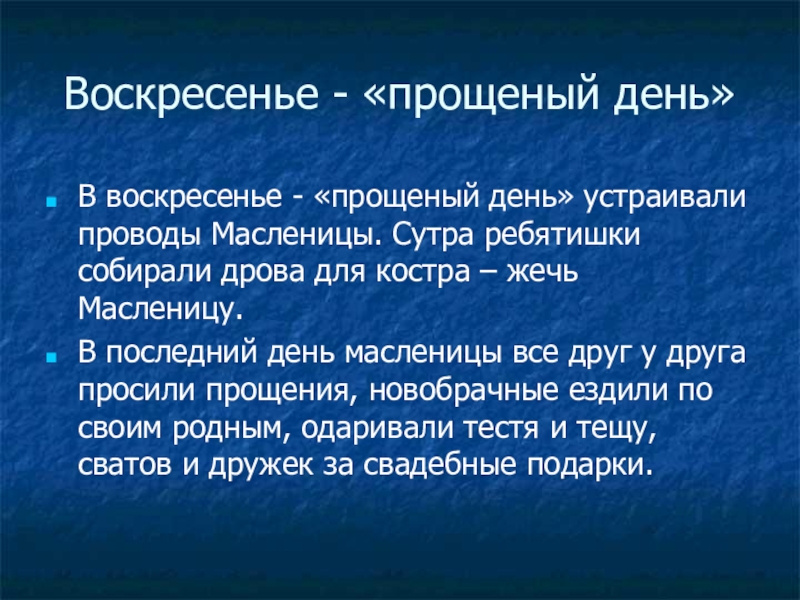 В последний день масленицы все друг у друга просили прощения, новобрачные ездили по своим родным, одаривали тестя и тещу, сватов и дружек за свадебные подарки.