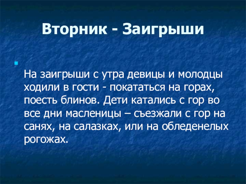 гости - покататься на горах, поесть блинов. Дети катались с гор во все дни масленицы – съезжали с гор на санях, на салазках, или на обледенелых рогожах.