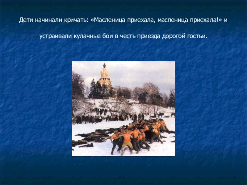 Слайд 8Дети начинали кричать: «Масленица приехала, масленица приехала!» и устраивали кулачные бои