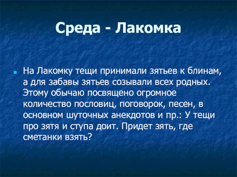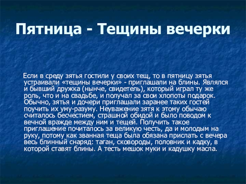 своих тещ, то в пятницу зятья устраивали «тещины вечерки» - приглашали на блины. Являлся и бывший дружка (нынче, свидетель), который играл ту же роль, что и на свадьбе, и получал за свои хлопоты подарок. Обычно, зятья и дочери приглашали заранее таких гостей поучить их уму-разуму. Неуважение зятя к этому обычаю считалось бесчестием, страшной обидой и было поводом к вечной вражде между ним и тещей. Получить такое приглашение почиталось за великую честь, да и молодым на руку, потому как званная теща была обязана прислать с вечера весь блинный снаряд: таган, сковороды, половник и кадку, в которой ставят блины. А тесть мешок муки и кадушку масла.