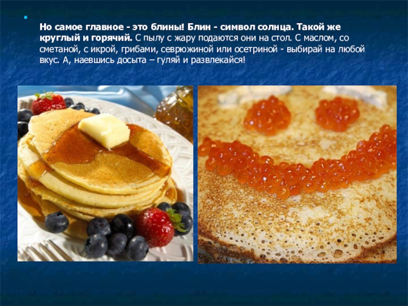 же круглый и горячий. С пылу с жару подаются они на стол. С маслом, со сметаной, с икрой, грибами, севрюжиной или осетриной - выбирай на любой вкус. А, наевшись досыта – гуляй и развлекайся!