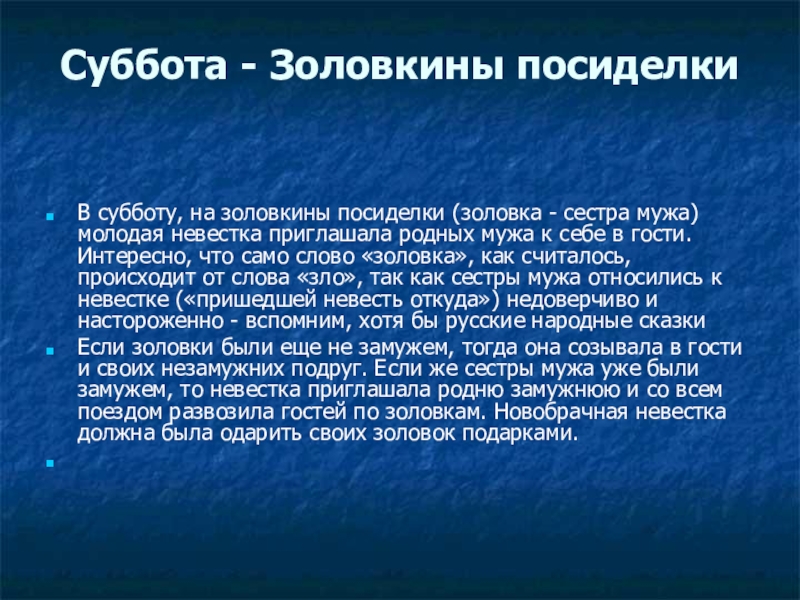 мужа) молодая невестка приглашала родных мужа к себе в гости. Интересно, что само слово «золовка», как считалось, происходит от слова «зло», так как сестры мужа относились к невестке («пришедшей невесть откуда») недоверчиво и настороженно - вспомним, хотя бы русские народные сказки