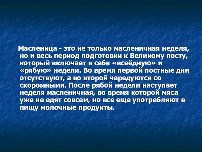 весь период подготовки к Великому посту, который включает в себя «всеёдную» и «рябую» недели. Во время первой постные дни отсутствуют, а во второй чередуются со скоромными. После рябой недели наступает неделя масленичная, во время которой мяса уже не едят совсем, но все еще употребляют в пищу молочные продукты.