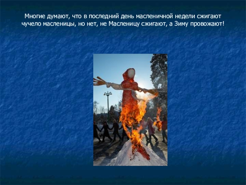 Слайд 19Многие думают, что в последний день масленичной недели сжигают чучело масленицы,