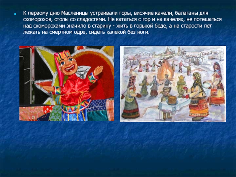 Слайд 9К первому дню Масленицы устраивали горы, висячие качели, балаганы для скоморохов,
