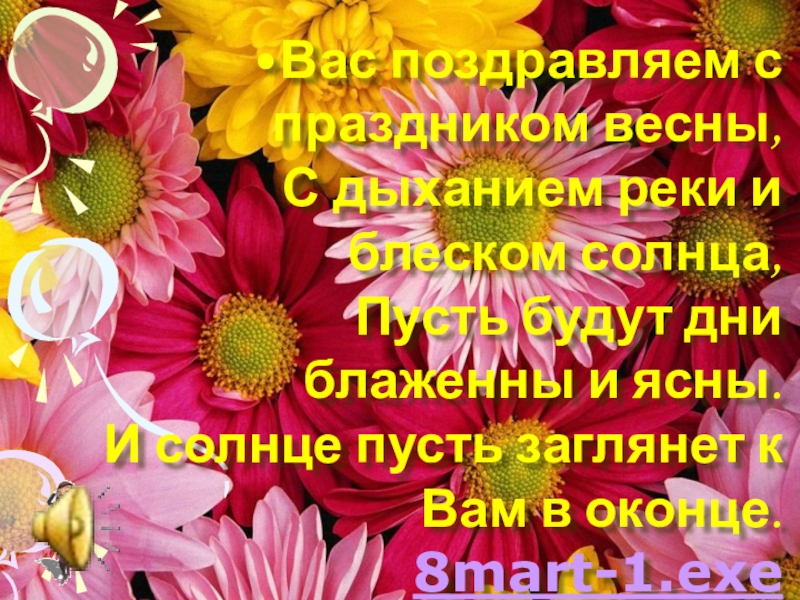 Вас поздравляем с праздником весны, С дыханием реки и блеском солнца, Пусть будут дни блаженны и ясны. И солнце пусть заглянет к Вам в оконце. 8mart-1.exe