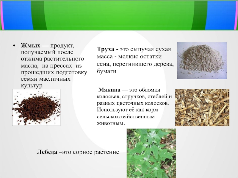Мякина — это обломки колосьев, стручков, стеблей и разных цветочных колосков. Используют её как корм сельскохозяйственным животным.