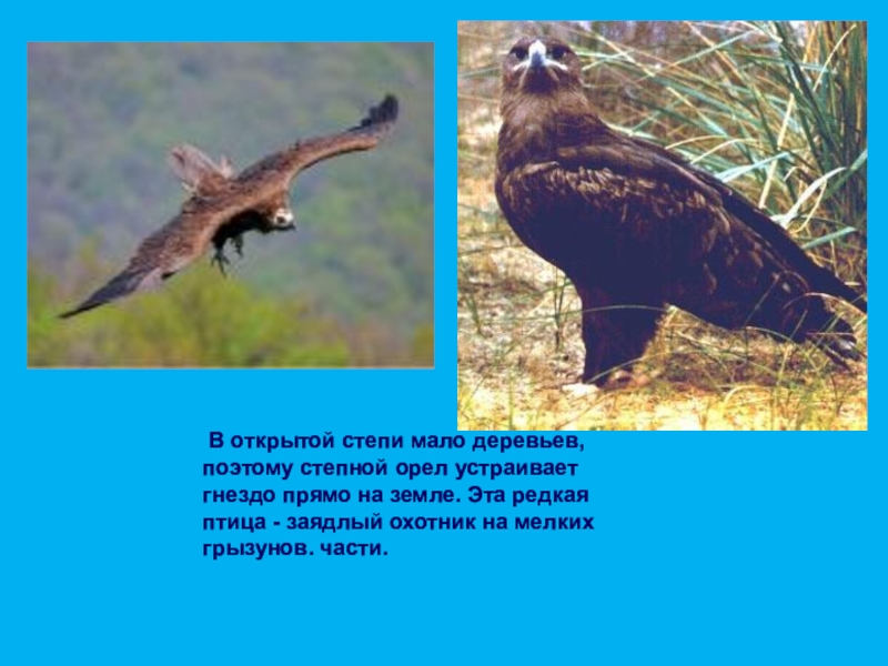 Слайд 35 В открытой степи мало деревьев, поэтому степной орел устраивает гнездо