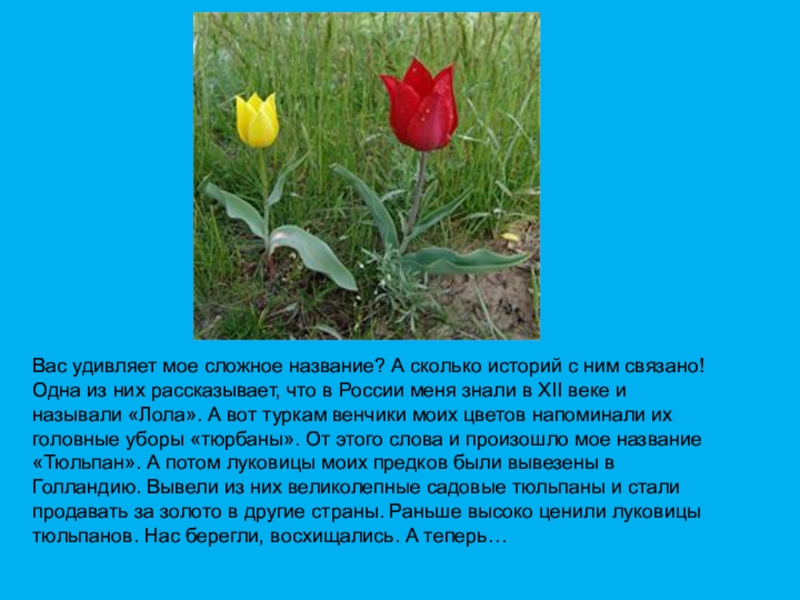Одна из них рассказывает, что в России меня знали в XII веке и называли «Лола». А вот туркам венчики моих цветов напоминали их головные уборы «тюрбаны». От этого слова и произошло мое название «Тюльпан». А потом луковицы моих предков были вывезены в Голландию. Вывели из них великолепные садовые тюльпаны и стали продавать за золото в другие страны. Раньше высоко ценили луковицы тюльпанов. Нас берегли, восхищались. А теперь…