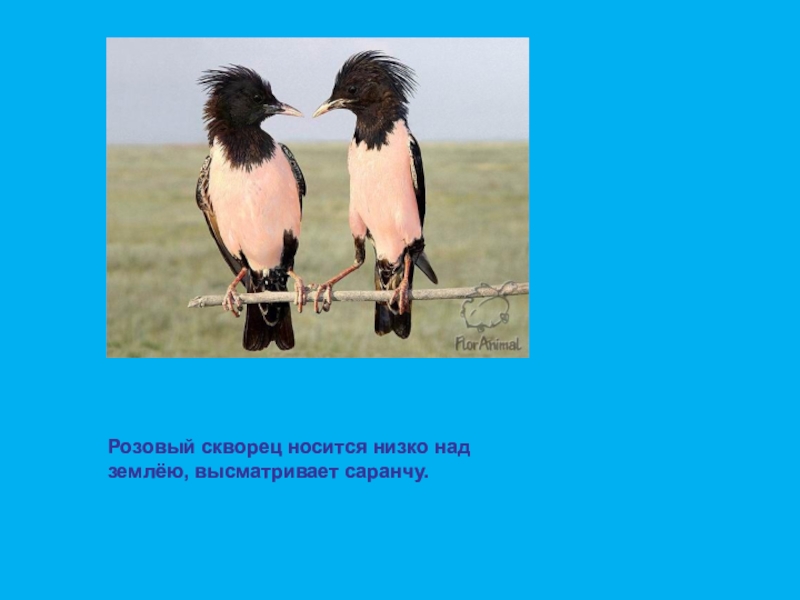 Слайд 28Розовый скворец носится низко над землёю, высматривает саранчу.
