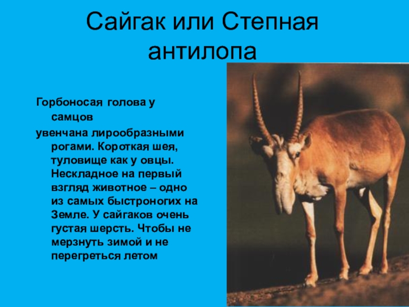туловище как у овцы. Нескладное на первый взгляд животное – одно из самых быстроногих на Земле. У сайгаков очень густая шерсть. Чтобы не мерзнуть зимой и не перегреться летом