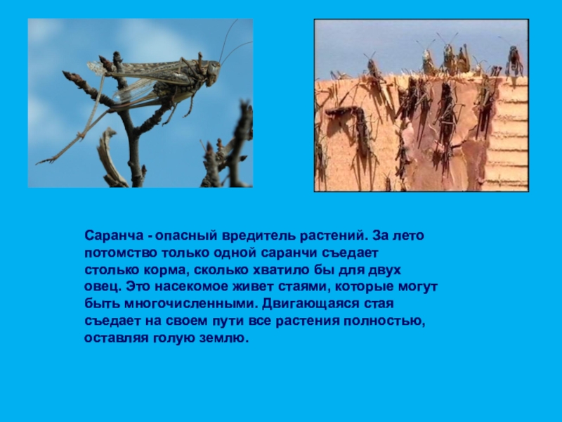 Слайд 29Саранча - опасный вредитель растений. За лето потомство только одной саранчи
