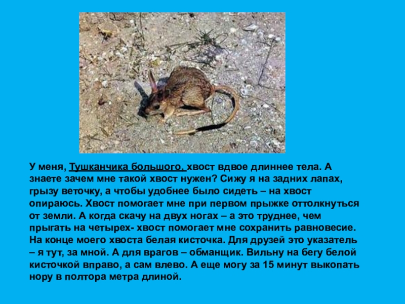 Слайд 32У меня, Тушканчика большого, хвост вдвое длиннее тела. А знаете зачем