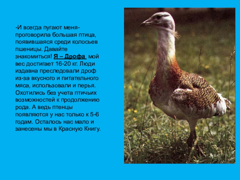 Давайте знакомиться! Я – Дрофа мой вес достигает 16-20 кг. Люди издавна преследовали дроф из-за вкусного и питательного мяса, использовали и перья. Охотились без учета птичьих возможностей к продолжению рода. А ведь птенцы появляются у нас только к 5-6 годам. Осталось нас мало и занесены мы в Красную Книгу.