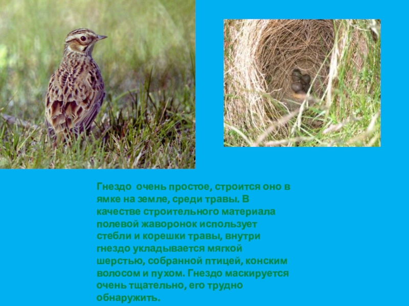 Слайд 27Гнездо очень простое, строится оно в ямке на земле, среди травы.