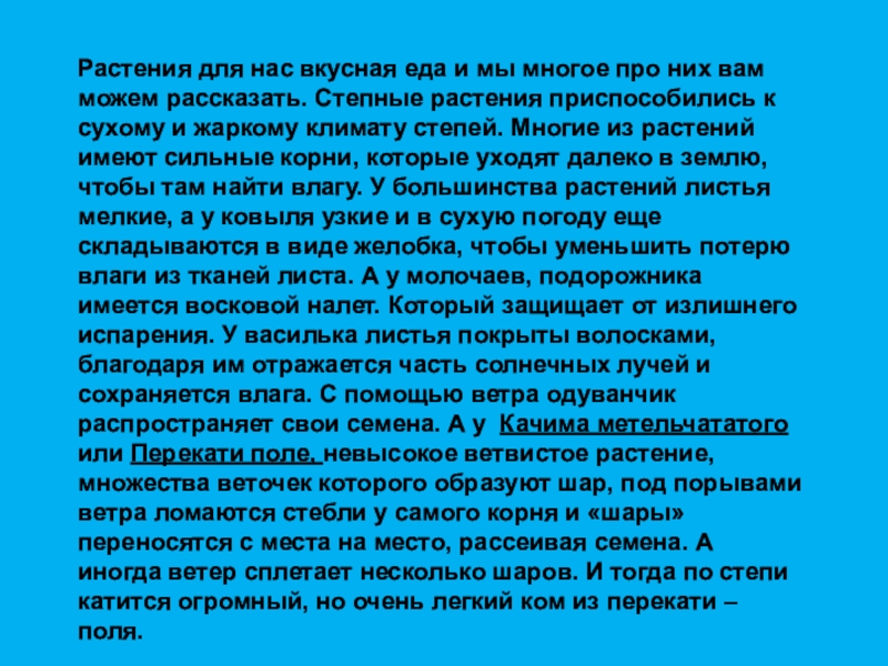 можем рассказать. Степные растения приспособились к сухому и жаркому климату степей. Многие из растений имеют сильные корни, которые уходят далеко в землю, чтобы там найти влагу. У большинства растений листья мелкие, а у ковыля узкие и в сухую погоду еще складываются в виде желобка, чтобы уменьшить потерю влаги из тканей листа. А у молочаев, подорожника имеется восковой налет. Который защищает от излишнего испарения. У василька листья покрыты волосками, благодаря им отражается часть солнечных лучей и сохраняется влага. С помощью ветра одуванчик распространяет свои семена. А у Качима метельчататого или Перекати поле, невысокое ветвистое растение, множества веточек которого образуют шар, под порывами ветра ломаются стебли у самого корня и «шары» переносятся с места на место, рассеивая семена. А иногда ветер сплетает несколько шаров. И тогда по степи катится огромный, но очень легкий ком из перекати –поля.
