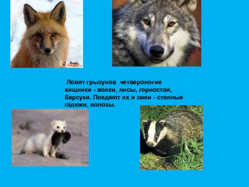 Слайд 26 Ловят грызунов четвероногие хищники - волки, лисы, горностаи, барсуки. Поедают