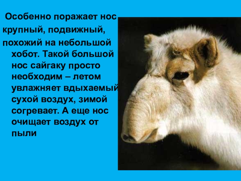 нос сайгаку просто необходим – летом увлажняет вдыхаемый сухой воздух, зимой согревает. А еще нос очищает воздух от пыли