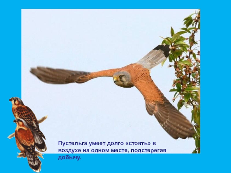 Слайд 38Пустельга умеет долго «стоять» в воздухе на одном месте, подстерегая добычу.