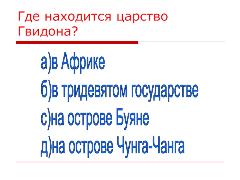 Где находится царство Гвидона?а)в Африке  б)в тридевятом государстве  с)на острове Буяне  д)на острове Чунга-Чанга