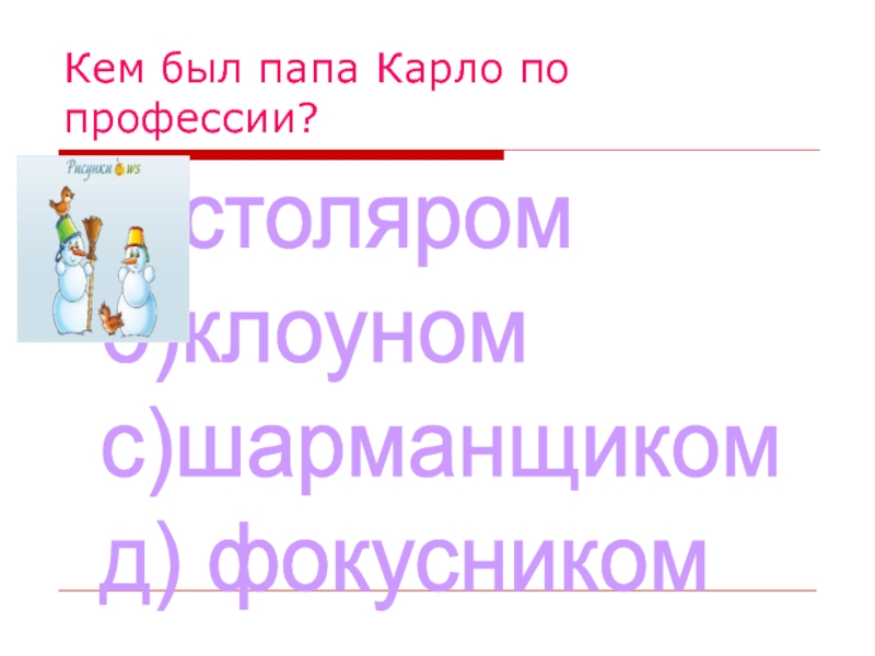 Кем был папа Карло по профессии?а)столяром  б)клоуном  с)шарманщиком  д) фокусником