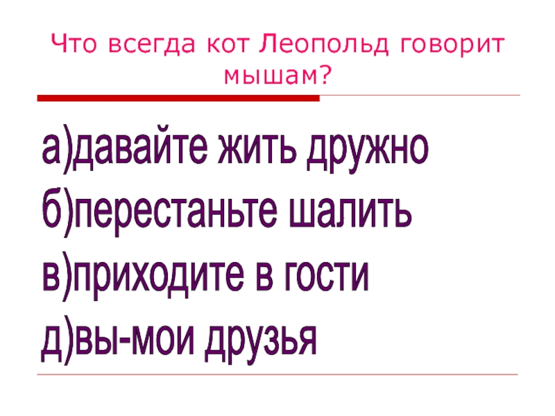 Что всегда кот Леопольд говорит мышам?а)давайте жить дружно  б)перестаньте шалить  в)приходите в гости  д)вы-мои