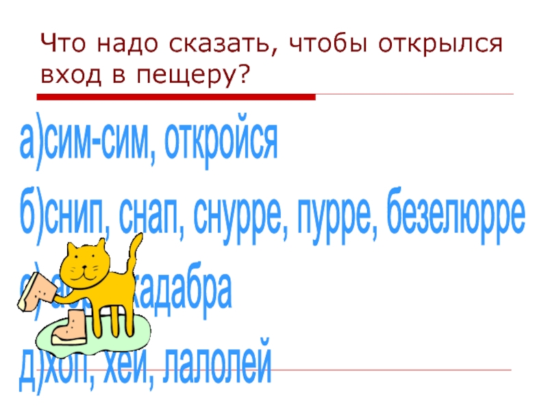 Что надо сказать, чтобы открылся вход в пещеру?а)сим-сим, откройся  б)снип, снап, снурре, пурре, безелюрре  с)