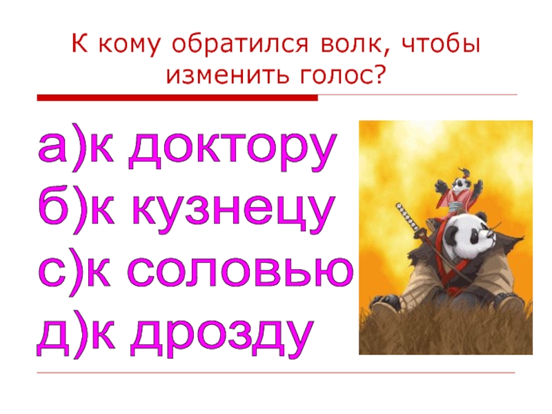 Слайд 37К кому обратился волк, чтобы изменить голос?