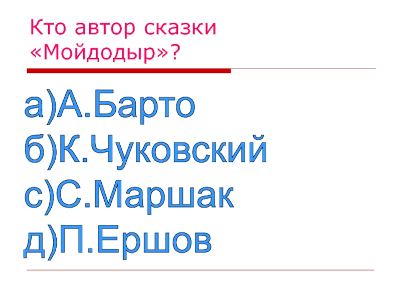 Кто автор сказки «Мойдодыр»?а)А.Барто  б)К.Чуковский  с)С.Маршак  д)П.Ершов