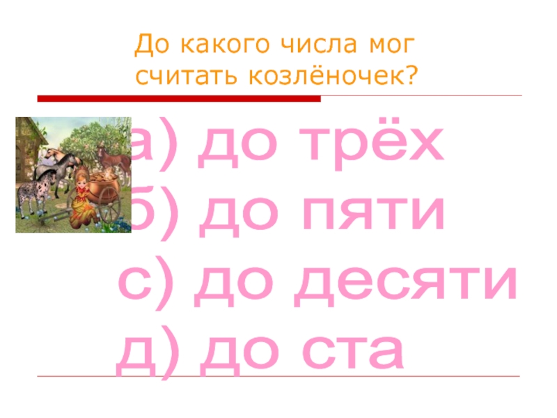 До какого числа мог считать козлёночек?а) до трёх  б) до пяти  с) до десяти