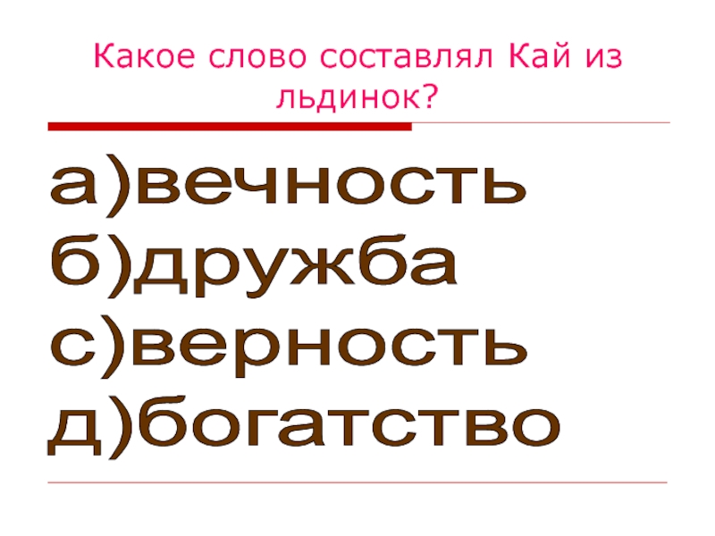 Какое слово составлял Кай из льдинок?а)вечность  б)дружба  с)верность  д)богатство