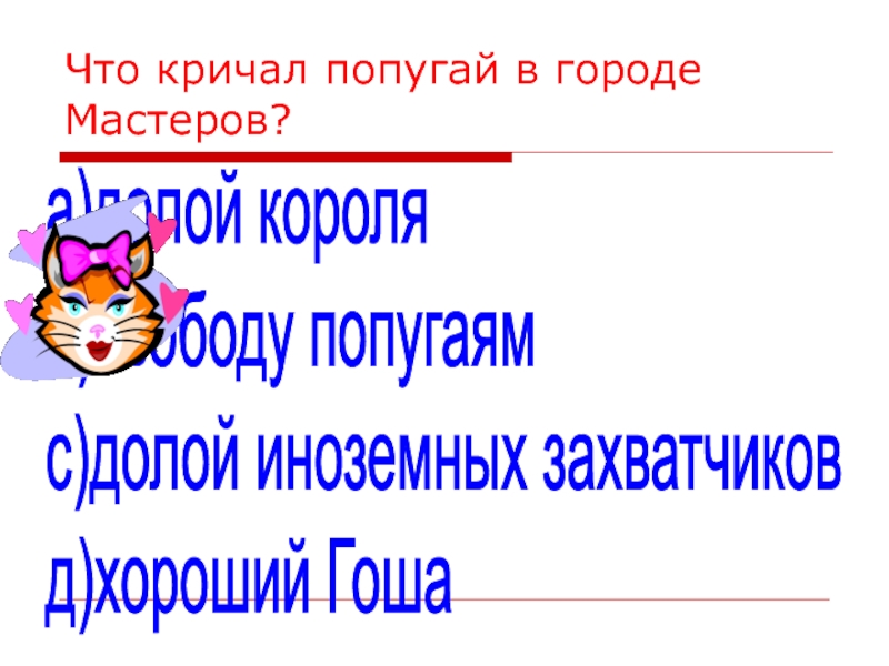 Что кричал попугай в городе Мастеров?а)долой короля  б)свободу попугаям  с)долой иноземных захватчиков  д)хороший Гоша