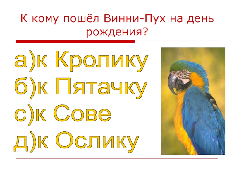 К кому пошёл Винни-Пух на день рождения?а)к Кролику  б)к Пятачку  с)к Сове  д)к Ослику