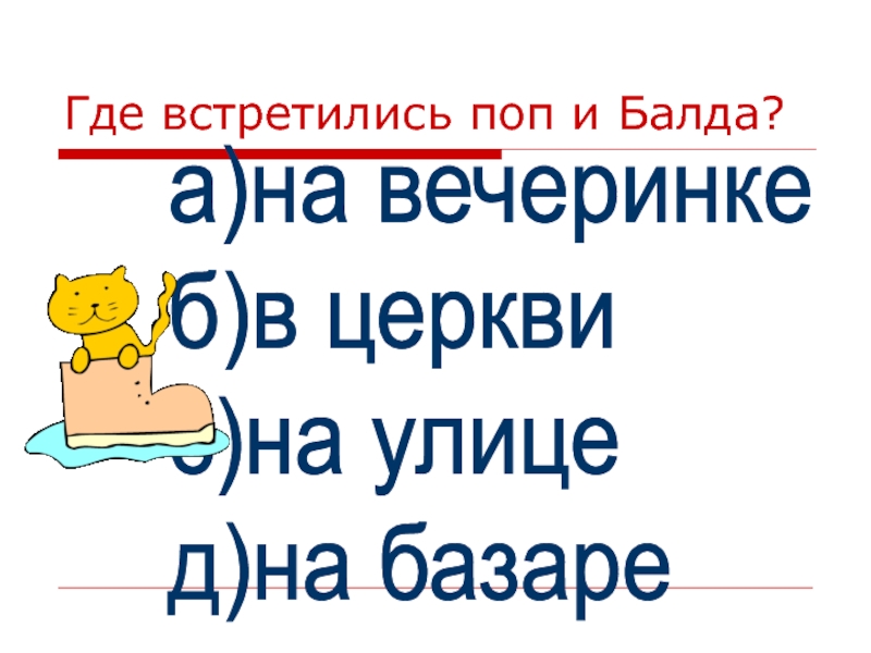 Где встретились поп и Балда?а)на вечеринке  б)в церкви  с)на улице  д)на базаре