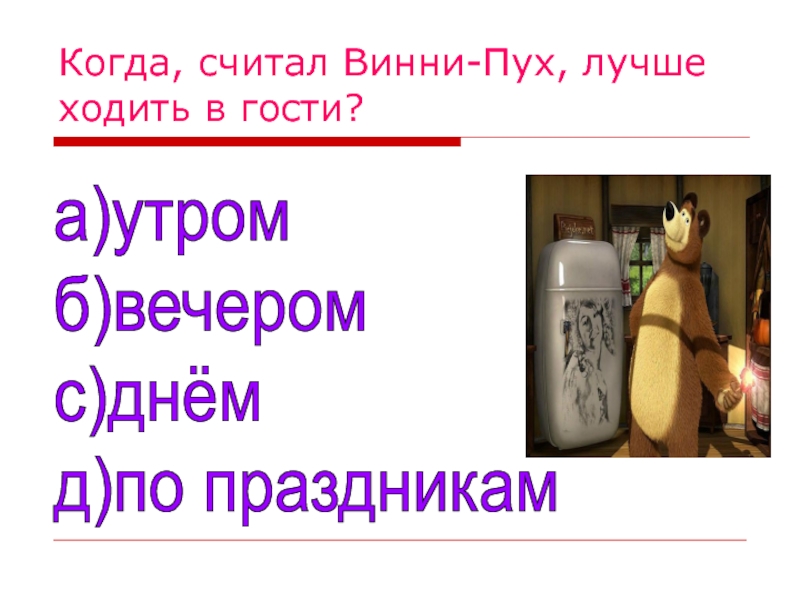 Слайд 41Когда, считал Винни-Пух, лучше ходить в гости?