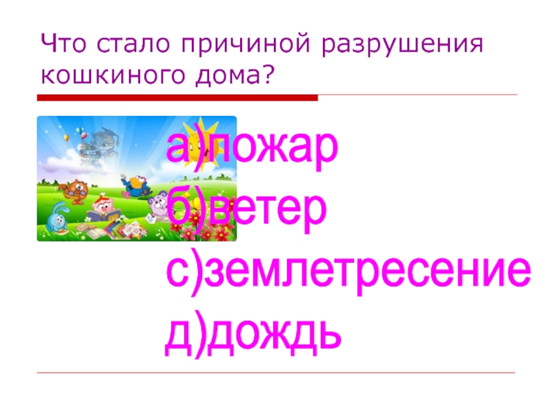 Что стало причиной разрушения кошкиного дома?а)пожар  б)ветер  с)землетресение  д)дождь