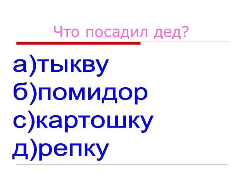 Что посадил дед?а)тыкву  б)помидор  с)картошку  д)репку
