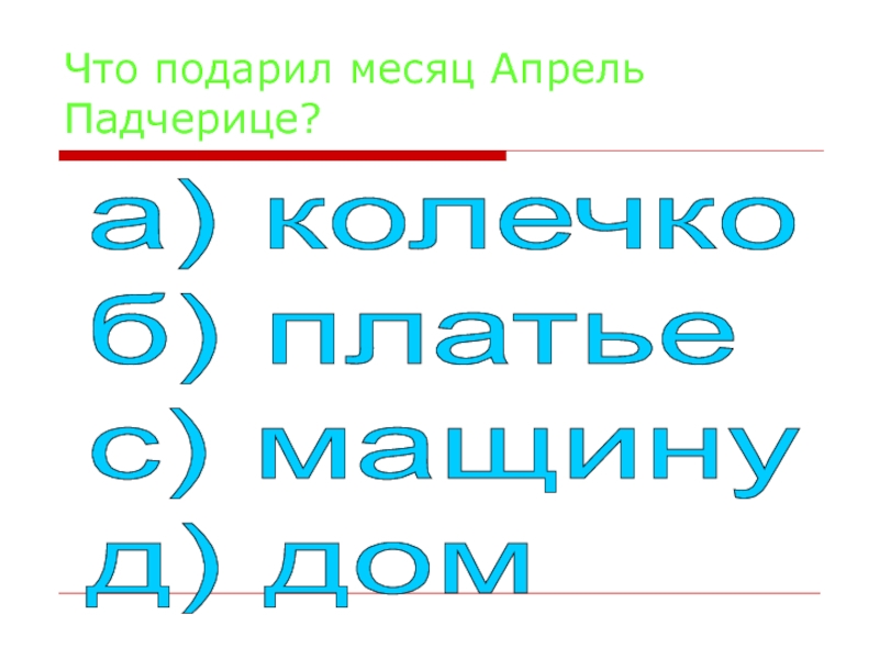 Что подарил месяц Апрель Падчерице?а) колечко  б) платье  с) мащину  д) дом