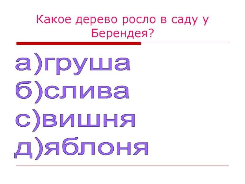 Какое дерево росло в саду у Берендея?а)груша  б)слива  с)вишня  д)яблоня