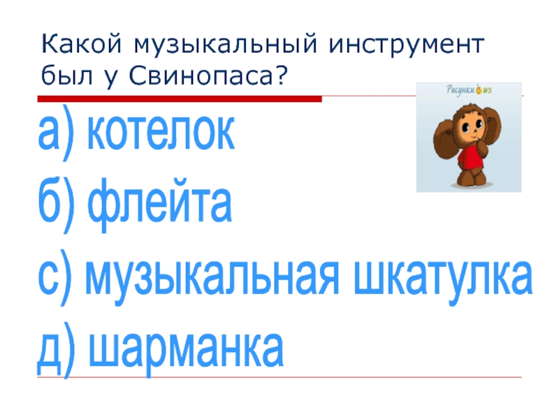 Какой музыкальный инструмент был у Свинопаса?а) котелок  б) флейта  с) музыкальная шкатулка  д) шарманка