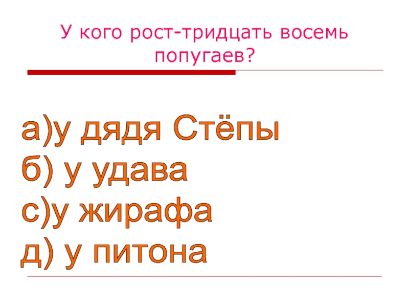 У кого рост-тридцать восемь попугаев?а)у дядя Стёпы  б) у удава  с)у жирафа  д) у