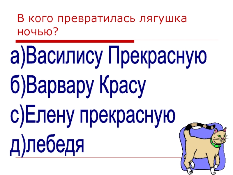 В кого превратилась лягушка ночью?а)Василису Прекрасную  б)Варвару Красу  с)Елену прекрасную  д)лебедя