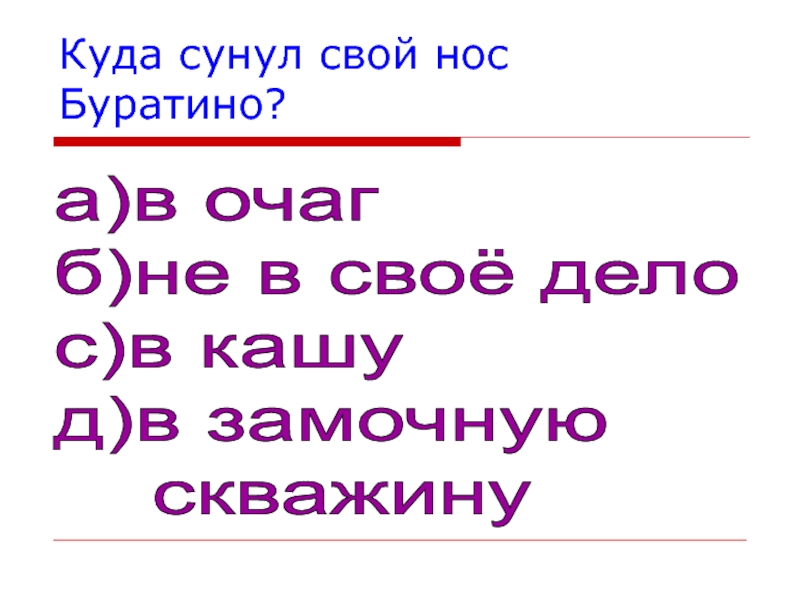Куда сунул свой нос Буратино?а)в очаг  б)не в своё дело  с)в кашу  д)в замочную