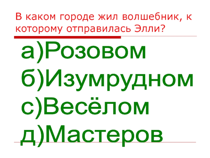 В каком городе жил волшебник, к которому отправилась Элли?а)Розовом  б)Изумрудном  с)Весёлом  д)Мастеров