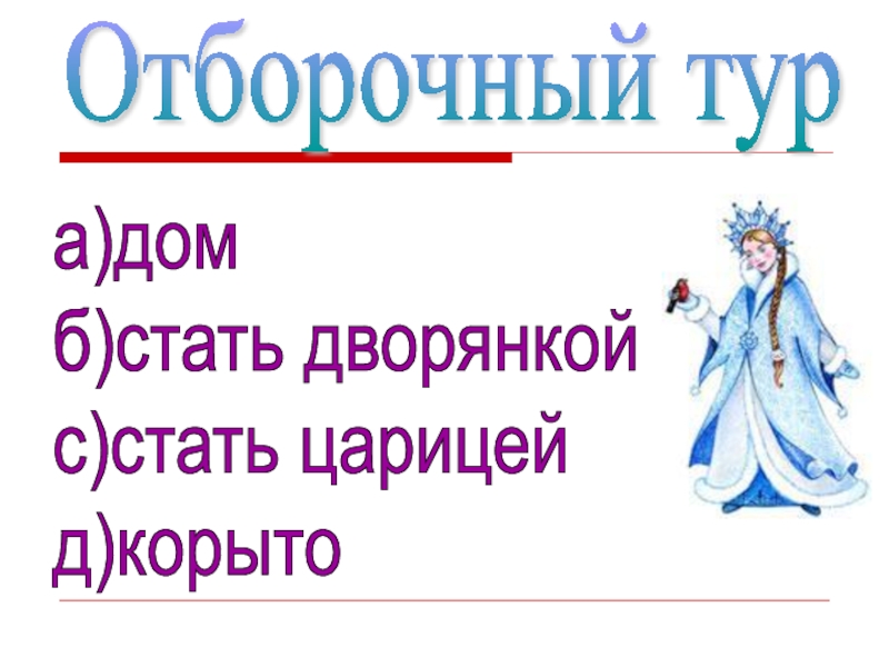 Отборочный тура)дом  б)стать дворянкой  с)стать царицей  д)корыто