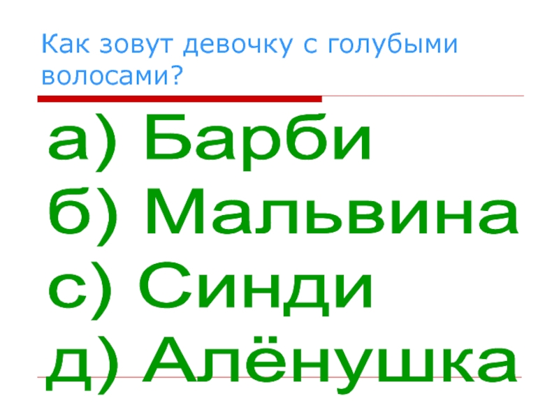 Как зовут девочку с голубыми волосами?а) Барби  б) Мальвина  с) Синди  д) Алёнушка